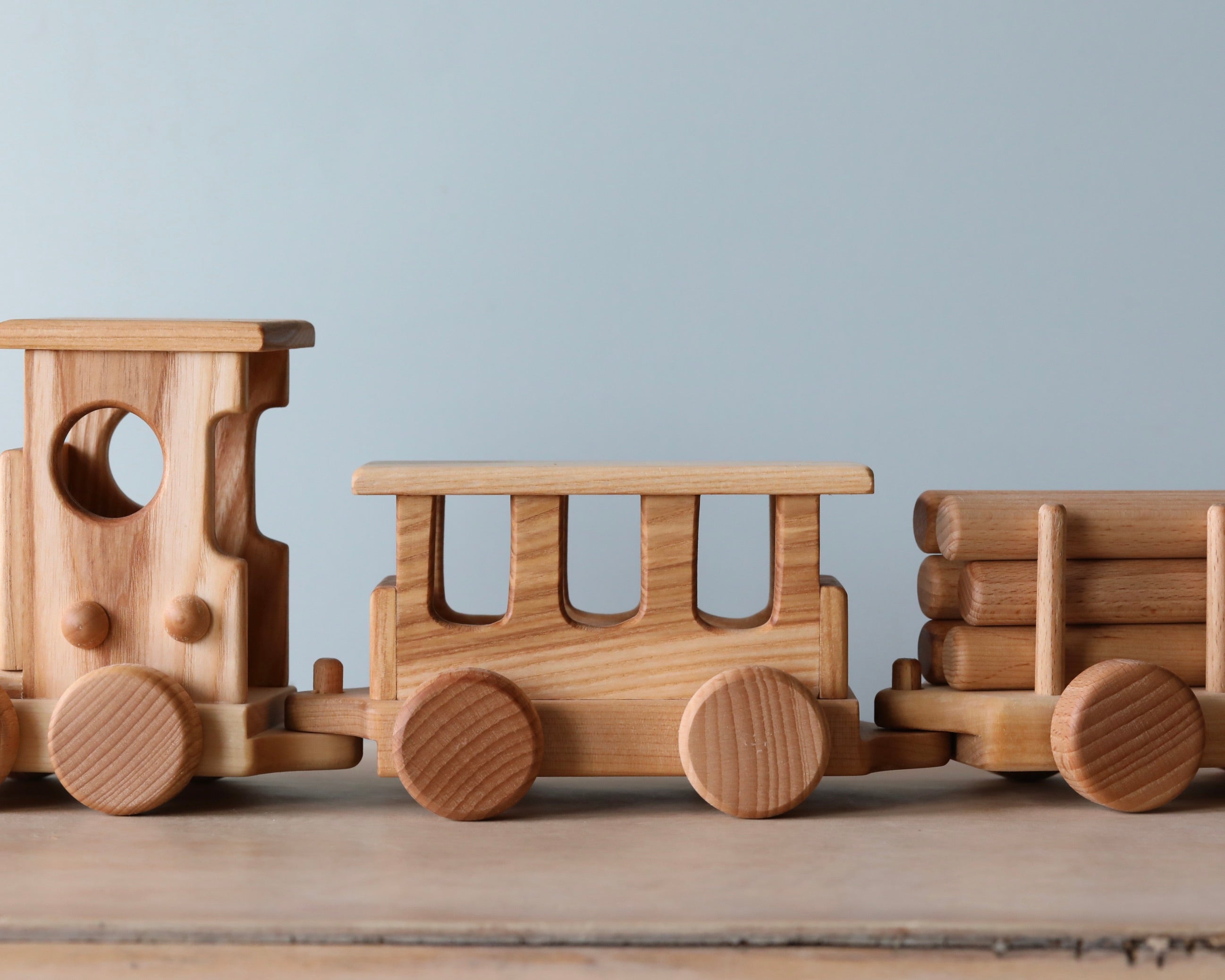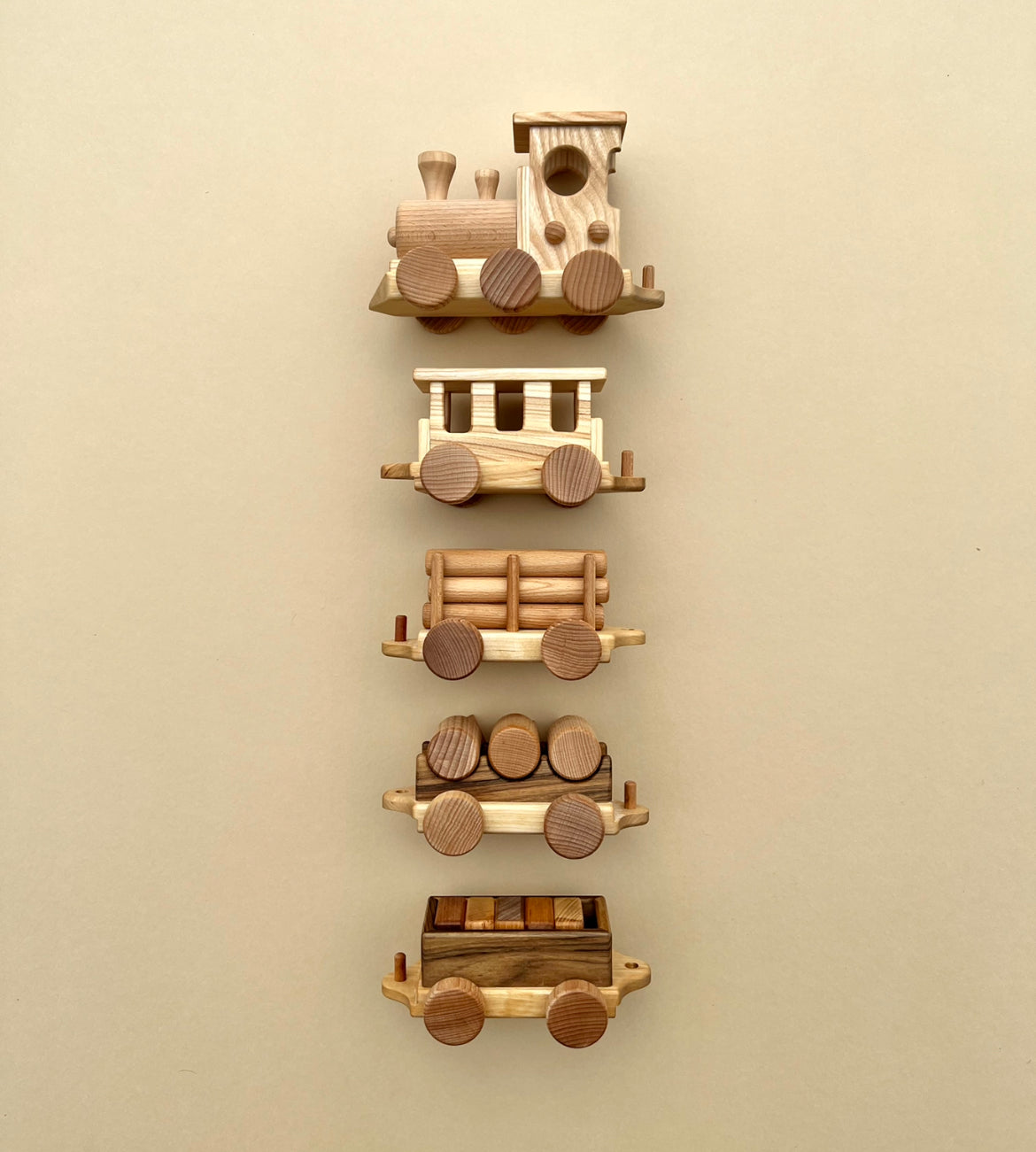 Handmade from beech wood, this set includes the locomotive, one passenger car and three freight cars.