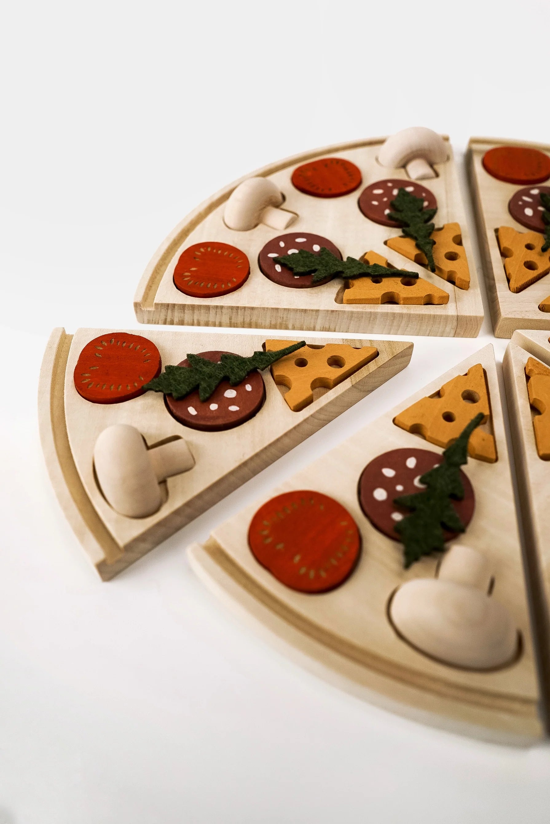 The pizza consists of 6 slices: two large and four small ones. Each has a selection of ingredients: tomato, sausage, mushroom, cheese and arugula (made of felt).