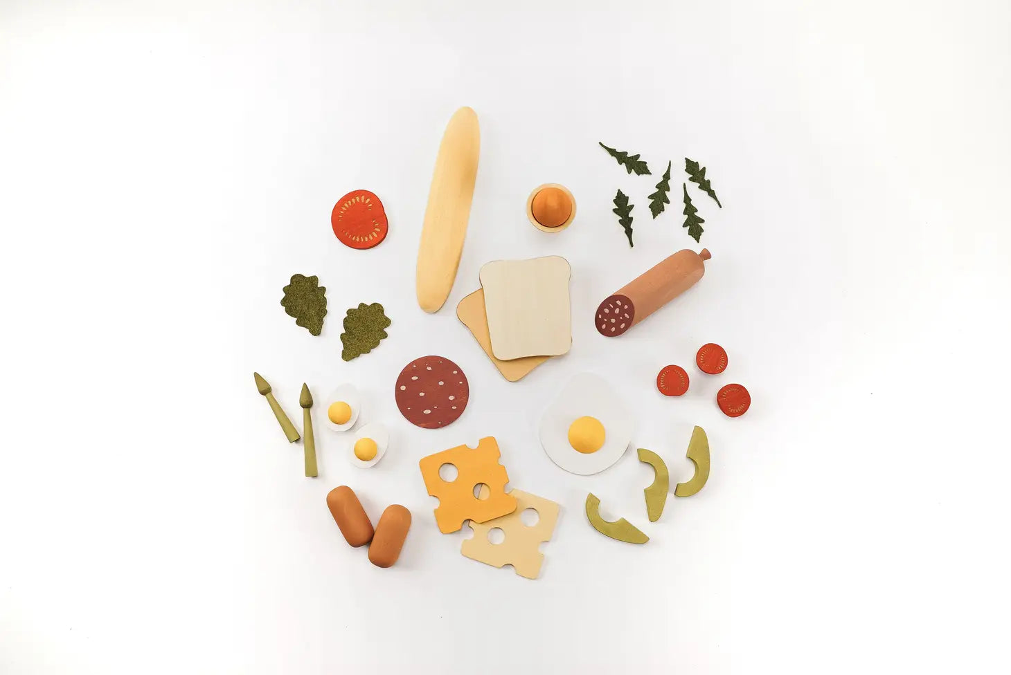 Fried egg: 8 cm / 3.15 inches Baguette: 17 cm / 6.7 inches Toast: 7 x 8 x 1 cm / 2.75 x 3.15 x 0.39 inches Paint: non-toxic water-based paint Recommended age: from 3 years Material: wood (linden or birch)